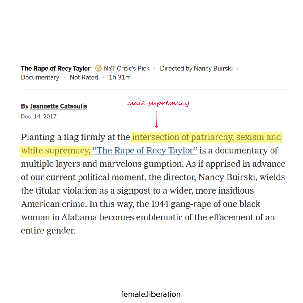 Recy Taylor had the courage, determination, and strength to stand up to male violence, to white violence, to rapists. She is the Woman, the Black Woman, who catalyzed several social movements in the U.S. including the female liberation movement and the Black liberation movement. With the aid of fellow freedom fighter Rosa Parks, Recy roused the consciousness of women everywhere that rape is a male creation for enforcing supremacism. The intersections of the oppressions she faced would go on to later inspire feminists such as Kimberlé Crenshaw and Tarana Burke to continue exposing how sexism and racism specifically target Black Women (and other female racial minorities). In this 2024 rape culture and culture of supremacy, I remember Recy Taylor and the power of truth tellers.